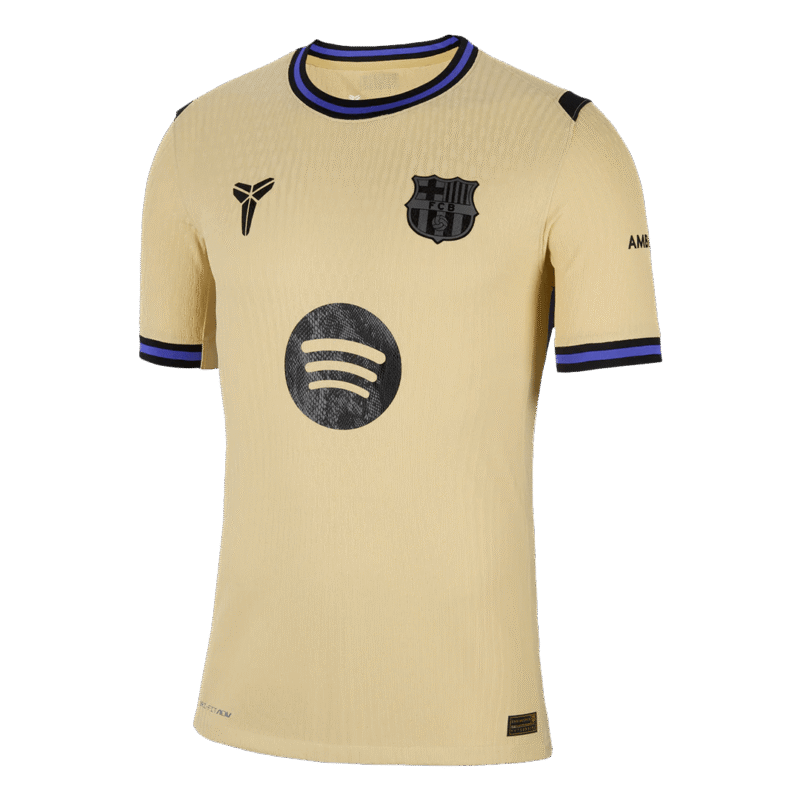 The new Barcelona Away Soccer Jersey 2025/26 x Kobe Bryant comes with premium details that make it truly special. Designed by Nike in the official "Team Gold / Black / Persian Violet" colorway, the kit showcases a subtle snake motif embedded in the Barça crest and is paired with black shorts featuring an Iron Grey Kobe logo and purple side panels. Fans can also enjoy 100% official name and number printing for stars such as Robert Lewandowski, Pedri, Lamine Yamal, Frenkie de Jong, and Gavi, with options available as an authentic jersey, replica jersey, or fan jersey.