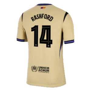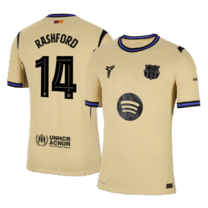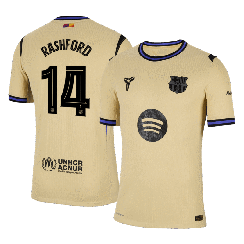 Unleash bold ambition with the RASHFORD #14 Barcelona away authentic jersey 2025/26. This standout Barcelona football jersey is inspired by Kobe Bryant's Mamba spirit—where greatness is the only goal. Designed by Nike, the UCL edition features a striking Team Gold base, contrasted with Black and Persian Violet accents for a look that blends legacy and power.