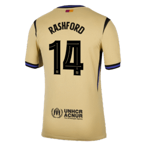 Unleash bold ambition with the RASHFORD #14 Barcelona away jersey 2025/26. This standout Barcelona football jersey is inspired by Kobe Bryant's Mamba spirit—where greatness is the only goal. Designed by Nike, the UCL edition features a striking Team Gold base, contrasted with Black and Persian Violet accents for a look that blends legacy and power.