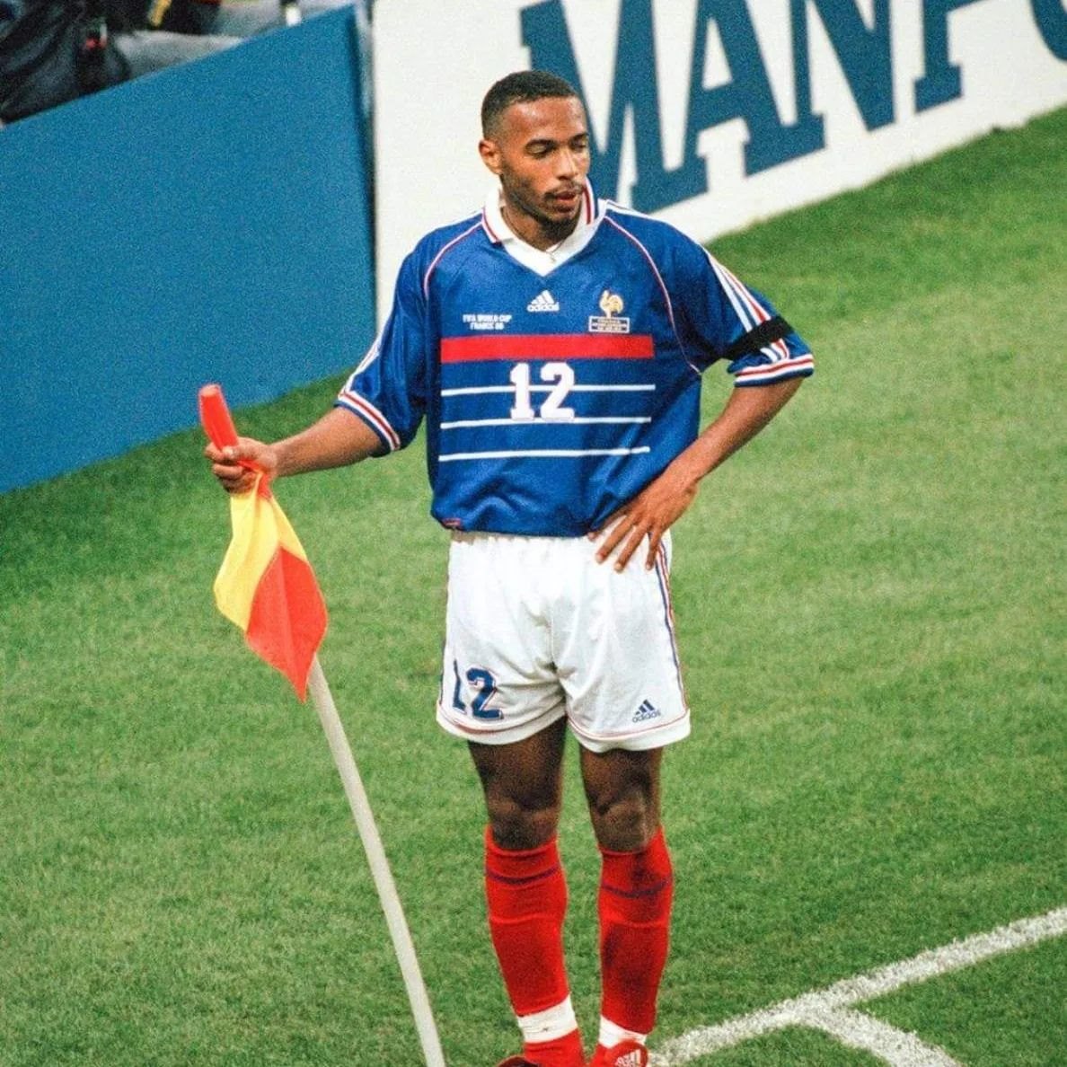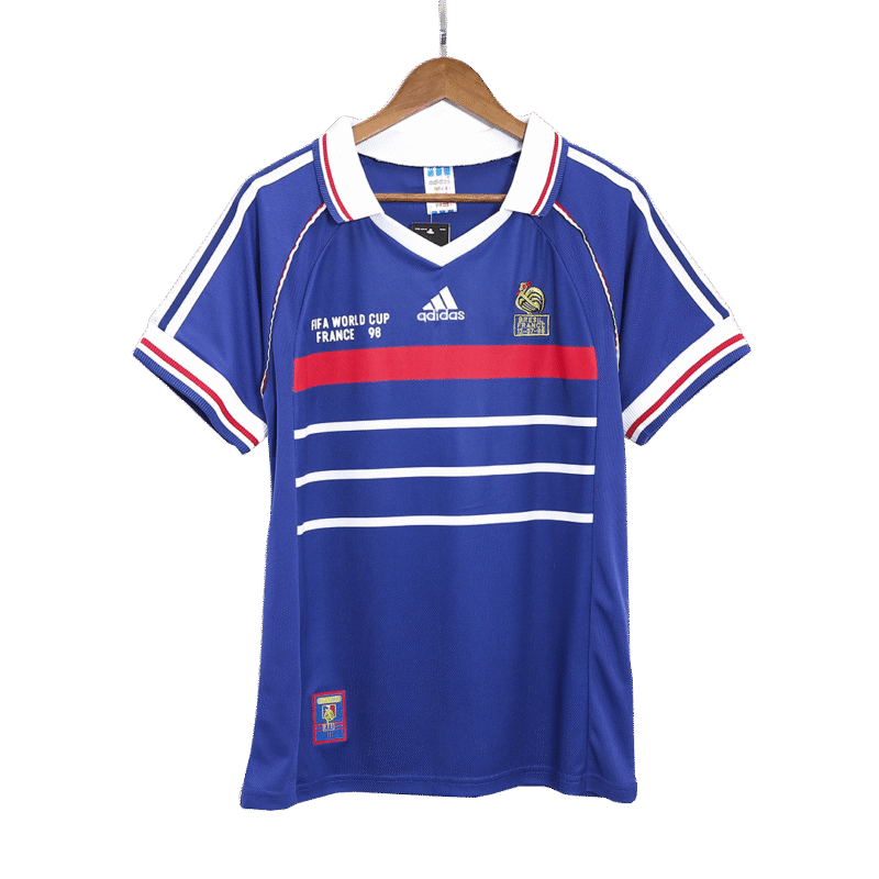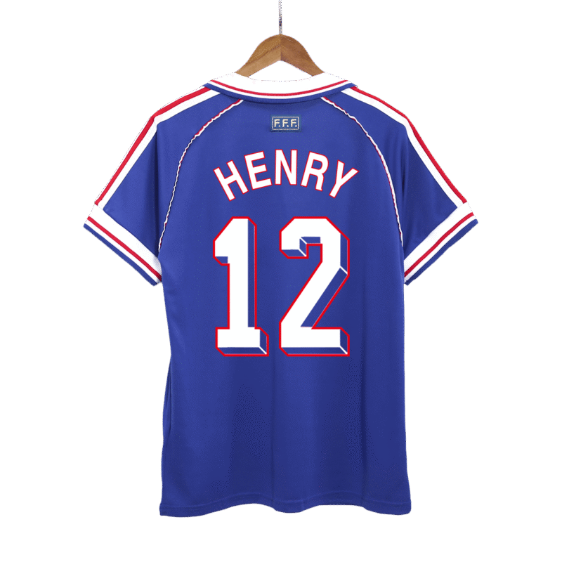 Let's look back on how Henry performed well in 1998 world cup. This 1998 france jersey made a history. France forward Thierry Henry chases the ball during the 1998 World Cup group game France against South Africa in Marseille. Henry scored the final 3-0 goal against South Africa and initiated a good start into the tournament. This france jersey is dominated by a bold and bright blue, with white spread across the neckline, shoulder and sleeves, while adding red lines, the white, blue and red france jersey won France their golden age. This france jersey is a must have for any true football fan or collector. The appearance of this france camiseta futbol is not only suitable for cheer up on the pitch, but also super suitable to wear when you work out. It's time to show your support for the iconic football club with this stylish and high-quality france jersey.